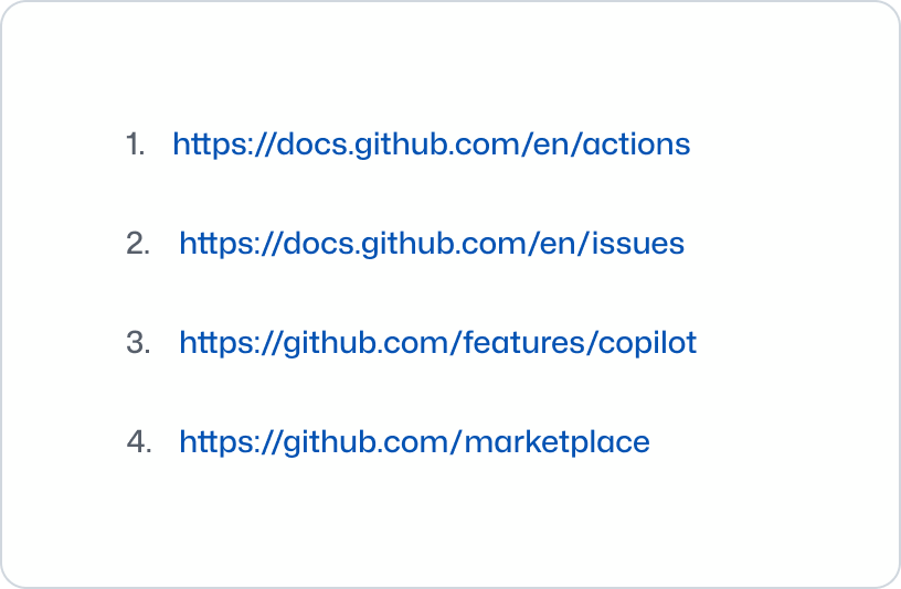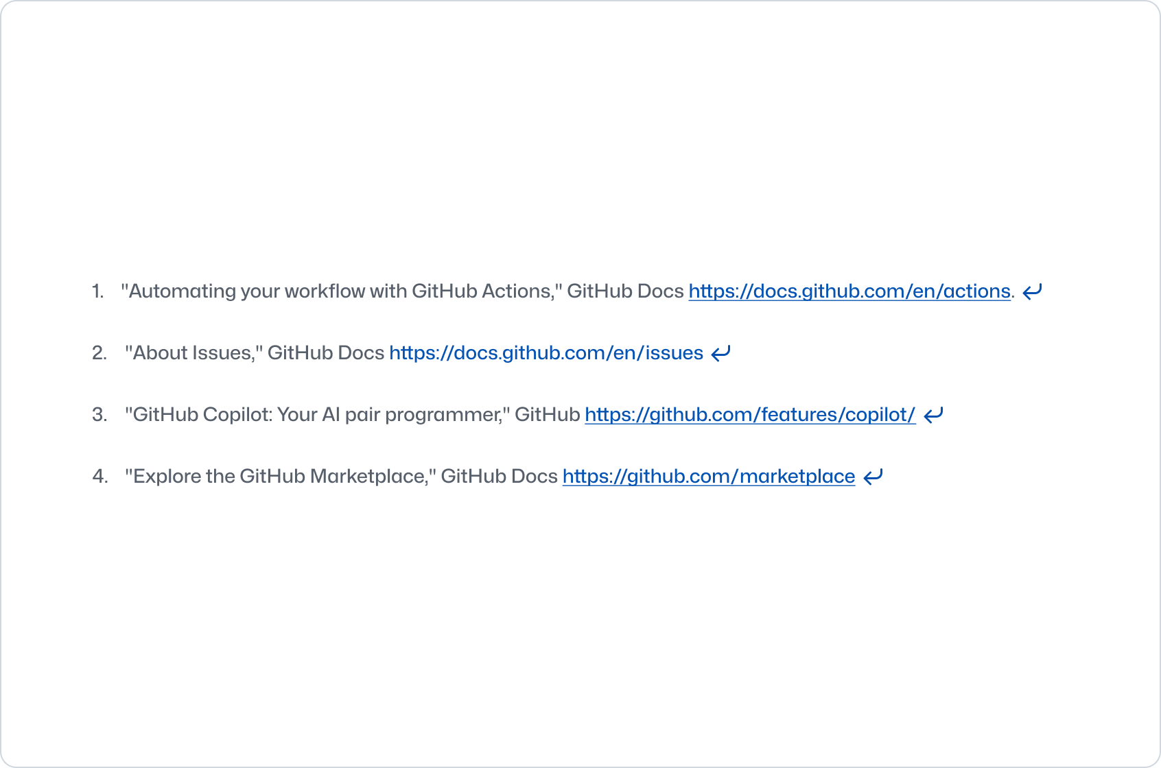 Citations in the format of a numbered list should feature both a local description and a link to return the user to the original context.